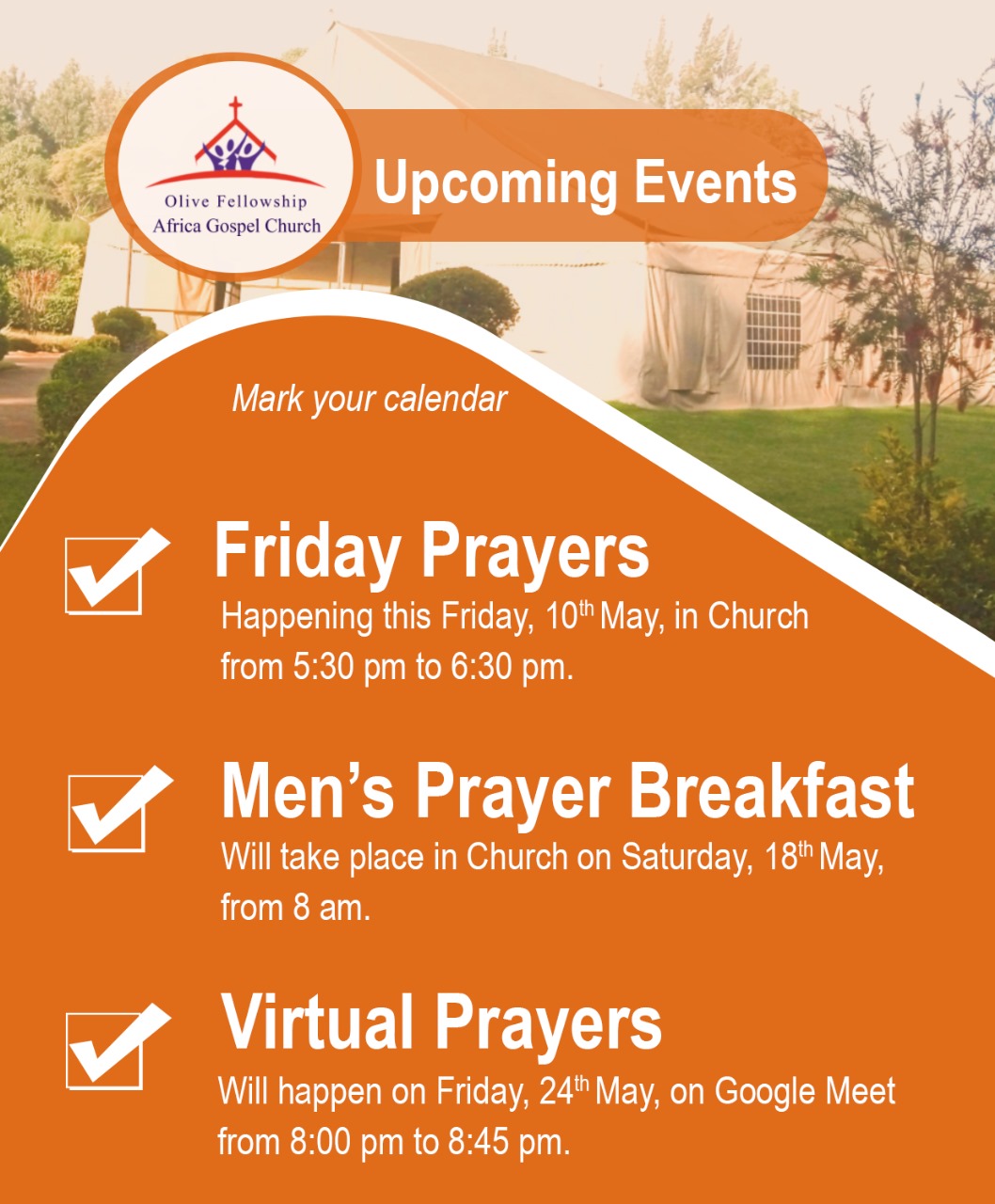 We will meet at Olive Fellowship church from 5.30 PM